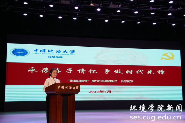 在支部理论宣讲环节,张萍萍以“珍视隐藏资源,做地下水的守护者”为题开展理论宣讲。她家乡山西临汾“母亲河”汾河的地下水污染防治为切入点,讲述了环境师生在地下水治理领域开展科研攻关,汾河也因此受益,获得“重生”。她号召新时代水文地质工作者要勇担使命责任,成为地下水的坚实守护者。最后她以“胸怀祖国,以红专能优为标彰显铁军风采;放眼世界,凭古今中外之学续写地大荣光”与大家共勉。