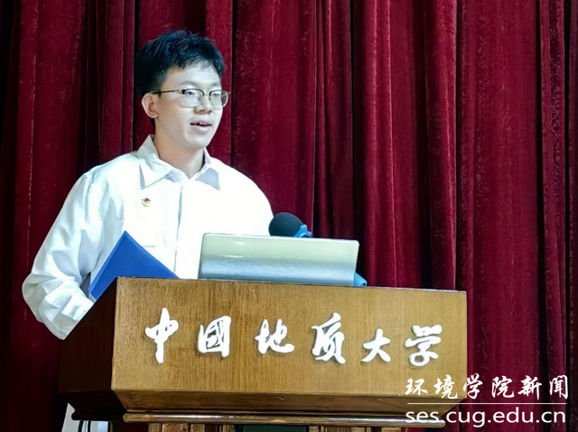 新生代表杨博超发言。他对这段时间为迎接和服务新生而辛勤付出的老师和学长学姐们表示衷心的感谢。他讲述自己对地大的向往和与环境保护事业的不解情缘,表示将勇担生态环保铁军的精神,为家乡的环境治理出一份力,在建设美丽中国的征程中奋斗不息。