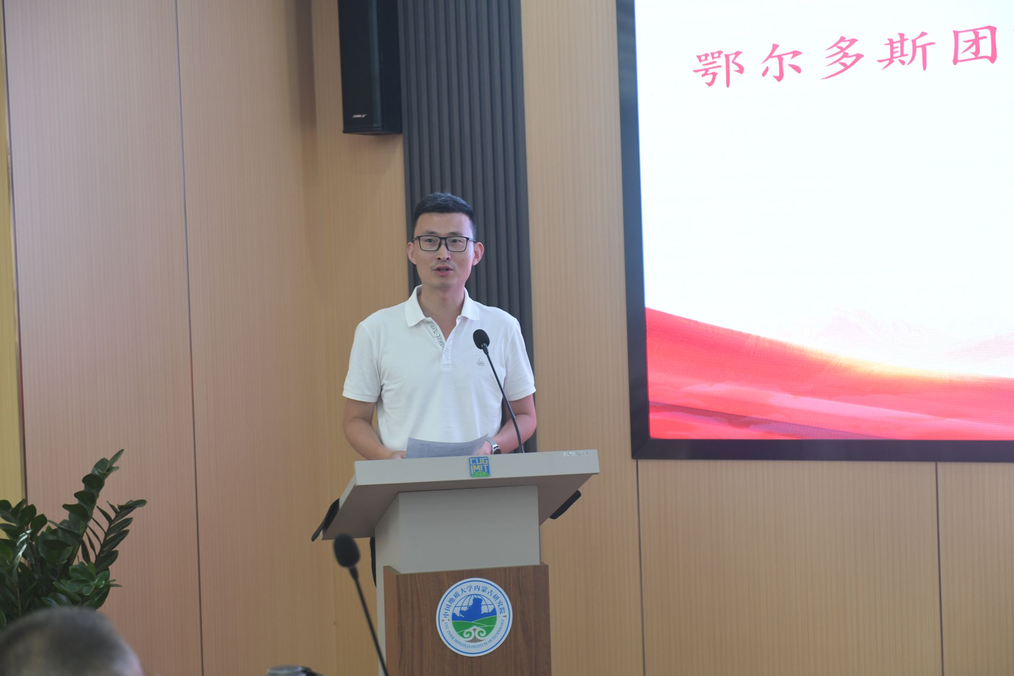 团委书记孟庆达汇报学院暑期社会实践工作体系和鄂尔多斯专项社会实践开展情况。