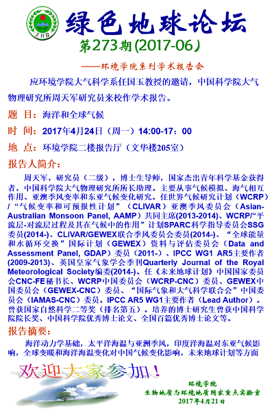 周天军,理学博士,研究员(二级),博士生导师,国家杰出青年科学基金获得者,中国科学院大气物理研究所所长助理。任世界气候研究计划(WCRP)/ “气候变率和可预报性计划”(CLIVAR)亚澳季风委员会(Asian-Australian Monsoon Panel, AAMP)共同主席(2013-2014)、WCRP/“平流层-对流层过程及其在气候中的作用”计划SPARC科学指导委员会SSG委员(2014-)、CLIVAR/GEWEX联合季风委员会委员(2014-)、“全球能量和水循环交换”国际计划(GEWEX)资料与评估委员会(Data and Assessment Panel, GDAP)委员(2011-)、IPCC WG1 AR5主要作者(2009-2013)、英国皇家气象学会季刊Quarterly Journal of the Royal Meteorological Society编委(2014-)。任《未来地球计划》中国国家委员会CNC-FE秘书长、WCRP中国委员会(WCRP-CNC)委员、GEWEX中国委员会(GEWEX-CNC)委员、“国际气象和大气科学联合会”中国委员会(IAMAS-CNC)委员。IPCC AR5 WG1主要作者(Lead Author)。主要从事气候模拟、海气相互作用、亚澳季风变率和东亚气候变化研究。曾获国家自然科学二等奖(排名第五)。培养的博士研究生曾获中国科学院院长奖、中国科学院优秀博士论文、全国百篇优秀博士论文等。