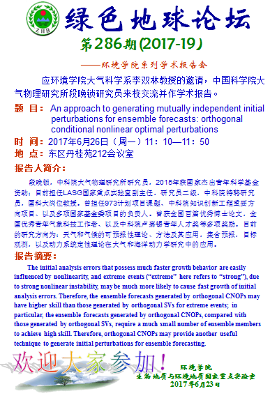 绿色地球论坛第286期(2017-19) ——18小说 系列学术报告会 题目:An approach to generating mutually independent initial perturbations for ensemble forecasts: orthogonal conditional nonlinear optimal perturbations 时间:2017年6月26日(周一)上午11:10—11:50 地点:东区丹桂苑212会议室
