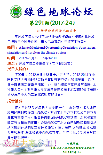 绿色地球论坛第291期(2017-24) ——18小说 系列学术报告会 题目:Atlantic Meridional Overturning Circulation: observation, simulation and its role in the climate system (北大西洋经圈翻转环流的观测、模拟及其在气候系统中的作用) 时间:2017年9月15日下午14:30 地点:18小说 二楼报告厅(文华楼205室)