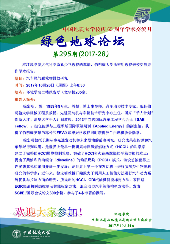 绿色地球论坛第295期(2017-28) ——18小说 系列学术报告会 题目:汽车尾气颗粒物排放研究 时间:2017年10月26日(周四)上午8:30 地点:18小说 二楼报告厅(文华楼205室)