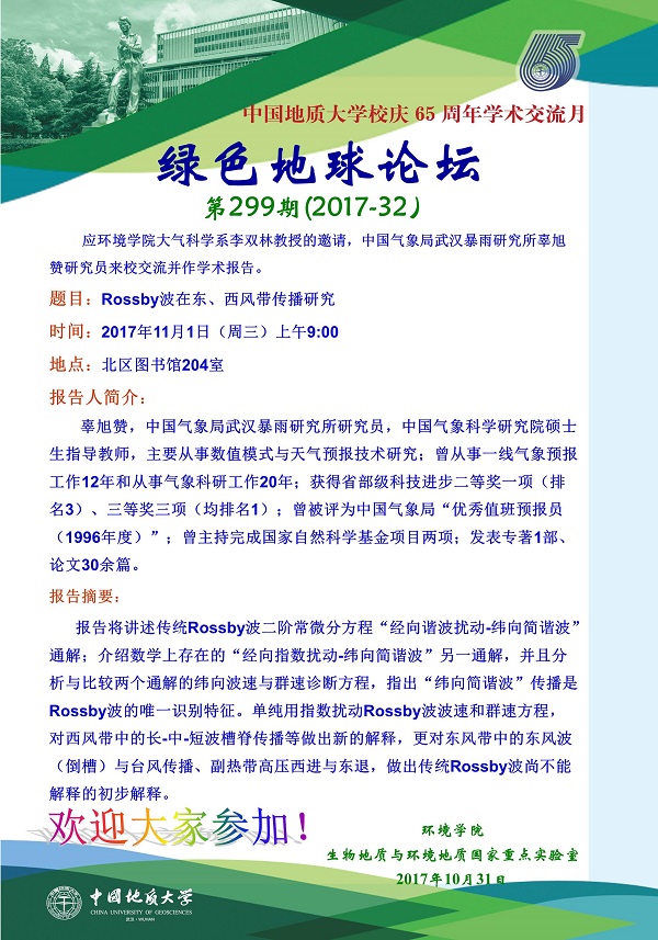 绿色地球论坛第299期(2017-32) ——18小说 系列学术报告会 题目:Rossby波在东、西风带传播研究 时间:2017年11月1日(周三)上午9:00 地点:北区图书馆204室