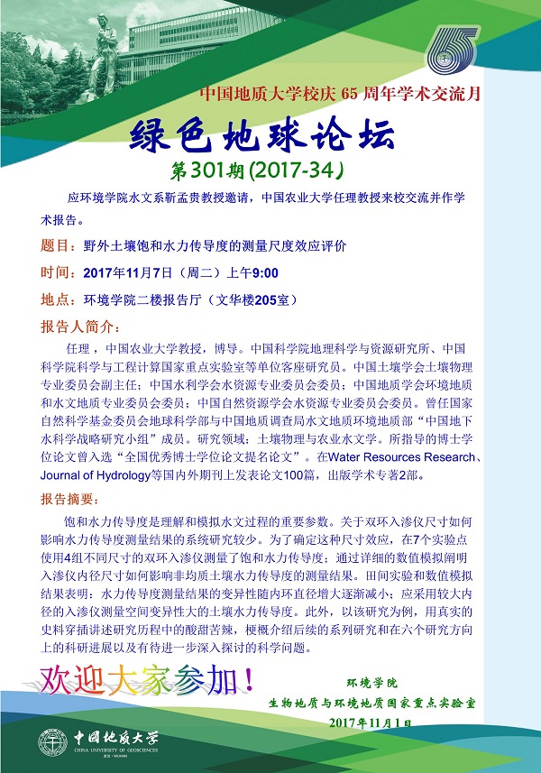 绿色地球论坛第301期(2017-34) ——18小说 系列学术报告会 题目:野外土壤饱和水力传导度的测量尺度效应评价 时间:2017年11月7日(周二)上午9:00 地点:18小说 二楼报告厅(文华楼205室)