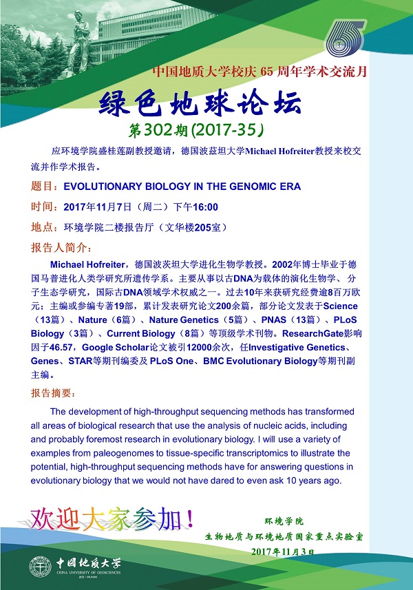 绿色地球论坛第302期(2017-35) ——18小说 系列学术报告会 题目:EVOLUTIONARY BIOLOGY IN THE GENOMIC ERA 时间:2017年11月7日(周二)下午16:00 地点:18小说 二楼报告厅(文华楼205室)