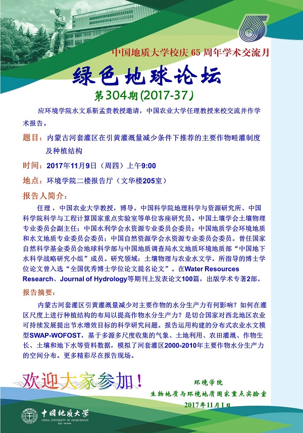 绿色地球论坛第304期(2017-37) ——18小说 系列学术报告会 题目:内蒙古河套灌区在引黄灌溉量减少条件下推荐的主要作物畦灌制度及种植结构 时间:2017年11月9日(周四)上午9:00 地点:18小说 二楼报告厅(文华楼205室)