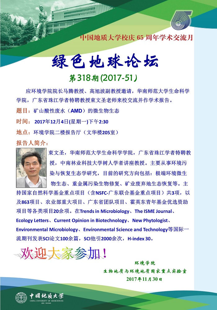 绿色地球论坛第318期(2017-51) 18小说 “校庆65周年学术交流月”——高知论坛 题目:矿山酸性废水(AMD)的微生物生态 时间:2017年12月4日(周一)下午14:30 地点:18小说 二楼学术报告厅(文华楼205室)