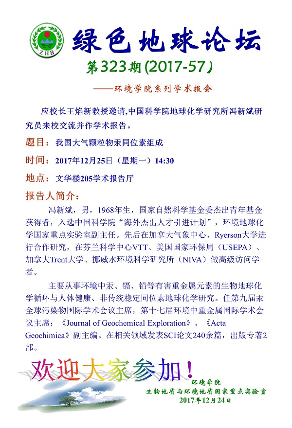 绿色地球论坛第323期(2017-57)——18小说 系列学术报告会 题目:我国大气颗粒物汞同位素组成 时间:2017年12月25日(星期一)下午14:30 地点:文华楼205学术报告厅