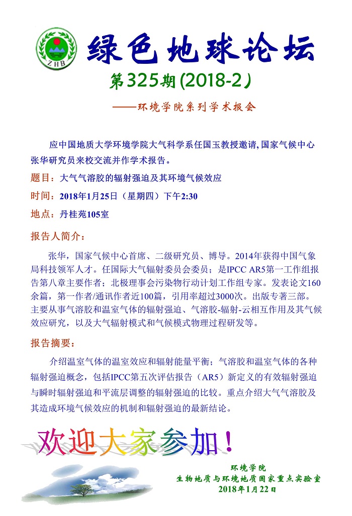 绿色地球论坛第325期(2018-2)——18小说 系列学术报告会 题目:大气气溶胶的辐射强迫及其环境气候效应 时间:2018年1月25日(星期四)下午2:30 地点:丹桂苑105室
