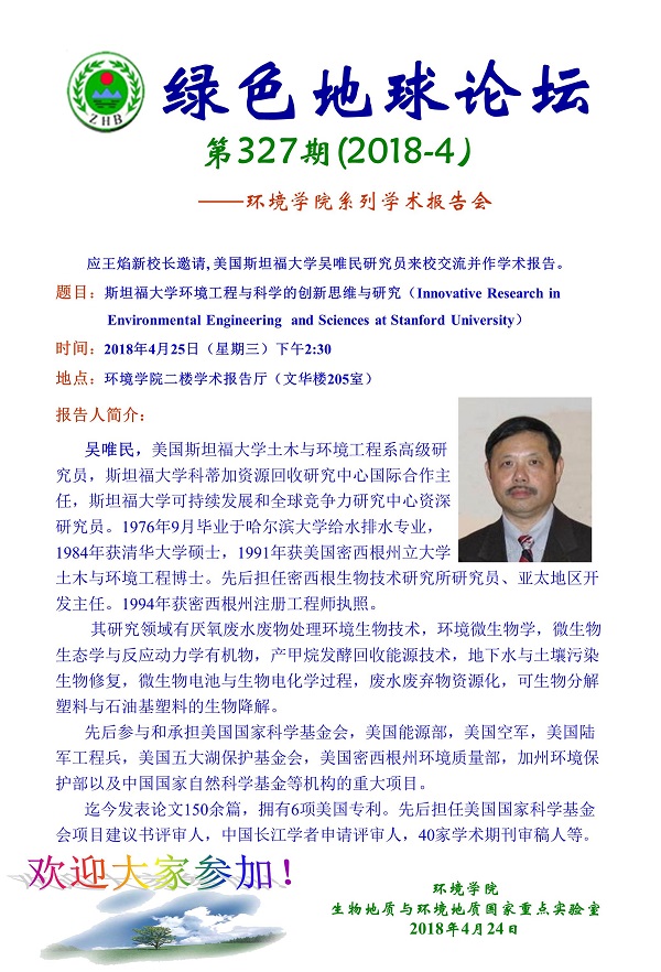 绿色地球论坛第327期(2018-4) ——18小说 系列学术报告会 题目:斯坦福大学环境工程与科学的创新思维与研究(Innovative Research in Environmental Engineering and Sciences at Stanford University) 时间:2018年4月25日(周三)下午2:30 地点:18小说 二楼学术报告厅(文华楼205室)