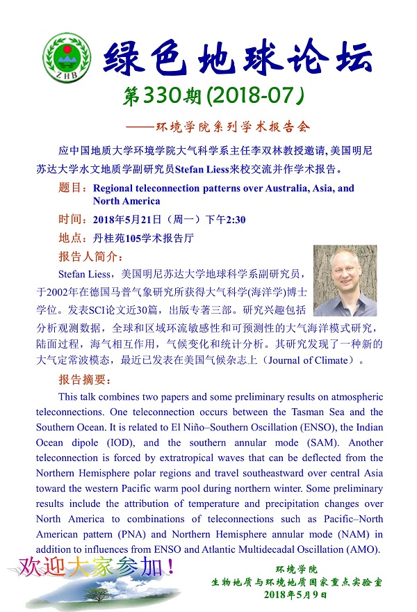 绿色地球论坛第330期(2018-7) ——18小说 系列学术报告会 题目:Regional teleconnection patterns over Australia,Asia, and North America 时间:2018年5月21日(周一)下午14:30 地点:丹桂苑105学术报告厅