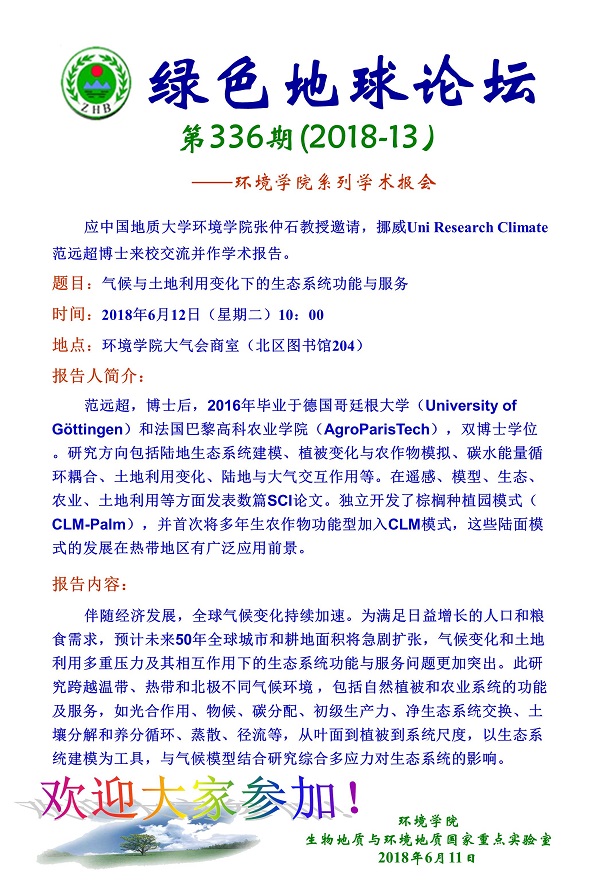 绿色地球论坛第336期(2018-13) ——18小说 系列学术报告会 题目:气候与土地利用变化下的生态系统功能与服务 时间:2018年6月12日上午10:00 地点:18小说 大气会商室(北区图书馆204)