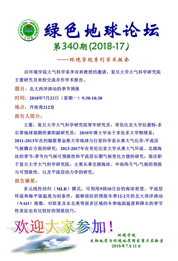 绿色地球论坛第340期(2018-17) ——18小说 系列学术报告会 题目:北大西洋涛动的季节预报 时间:2018年7月23日(星期一)9:30-10:30 地点:丹桂苑212室