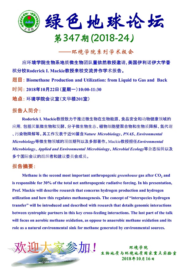 绿色地球论坛第347期(2018-24) ——18小说 系列学术报告会 题目:Biomethane Production and Utilization: from Liquid to Gas and Back 时间:2018年10月22日(周一)上午10:00-11:30 地点:18小说 会议室(文华楼201室)