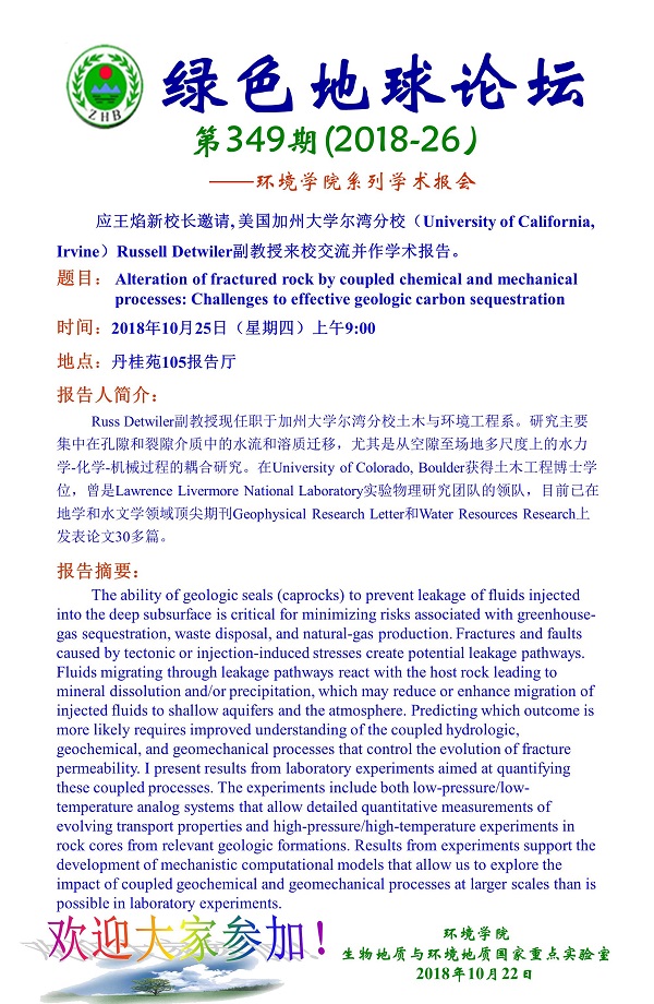 绿色地球论坛第349期(2018-26) ——18小说 系列学术报告会 题目:Alteration of fractured rock by coupled chemical and mechanical processes: Challenges to effective geologic carbon sequestration 时间:2018年10月25日(周四)上午9:00 地点:丹桂苑105报告厅