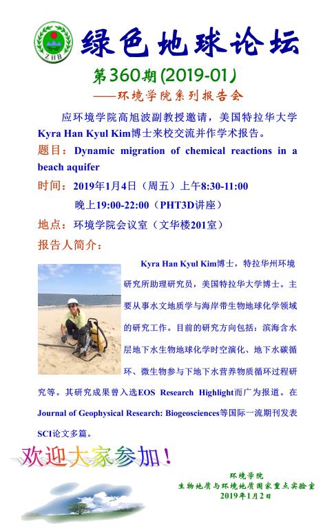 绿色地球论坛第360期(2019-01) ——18小说 系列学术报告会 题目:Dynamic migration of chemical reactions in a beach aquifer 时间:2019年1月4日(周五)8:30—11:00 19:00-22:00(PHT3D讲座) 地点:环境学院会议室(文华楼201室)