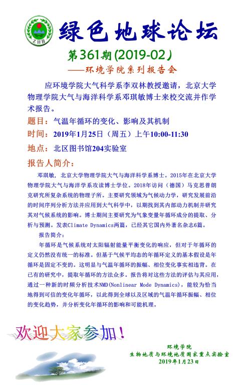 绿色地球论坛第361期(2019-02) ——18小说 系列学术报告会 题目:气温年循环的变化、影响及其机制 时间:2019年1月25日(周五)10:00—11:30 地点:北区图书馆204实验室