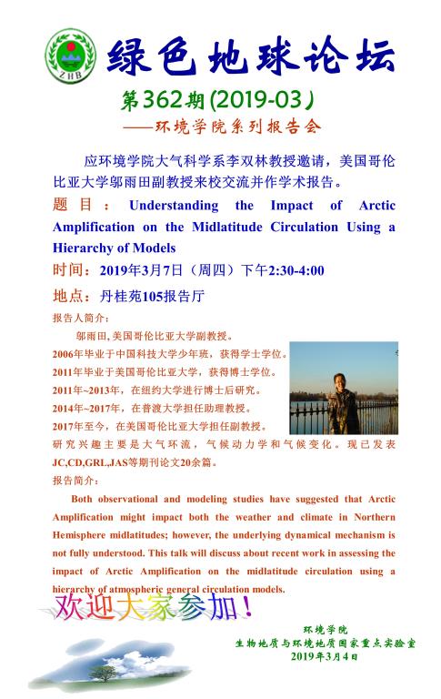 绿色地球论坛第362期(2019-03) ——18小说 系列学术报告会 题目:Understanding the Impact of Arctic Amplification on the Midlatitude Circulation Using a Hierarchy of Models 时间:2019年3月7日(周四)下午2:30-4:00 地点:丹桂苑105报告厅