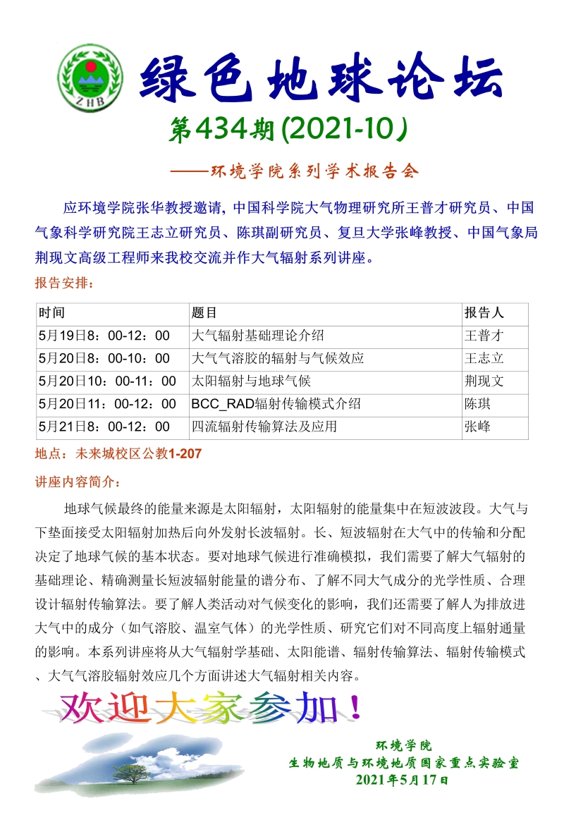 中国科学院大气物理研究所王普才研究员、中国气象科学研究院王志立研究员、陈琪副研究员、复旦大学张峰教授、中国气象局荆现文高级工程师作大气辐射系列讲座