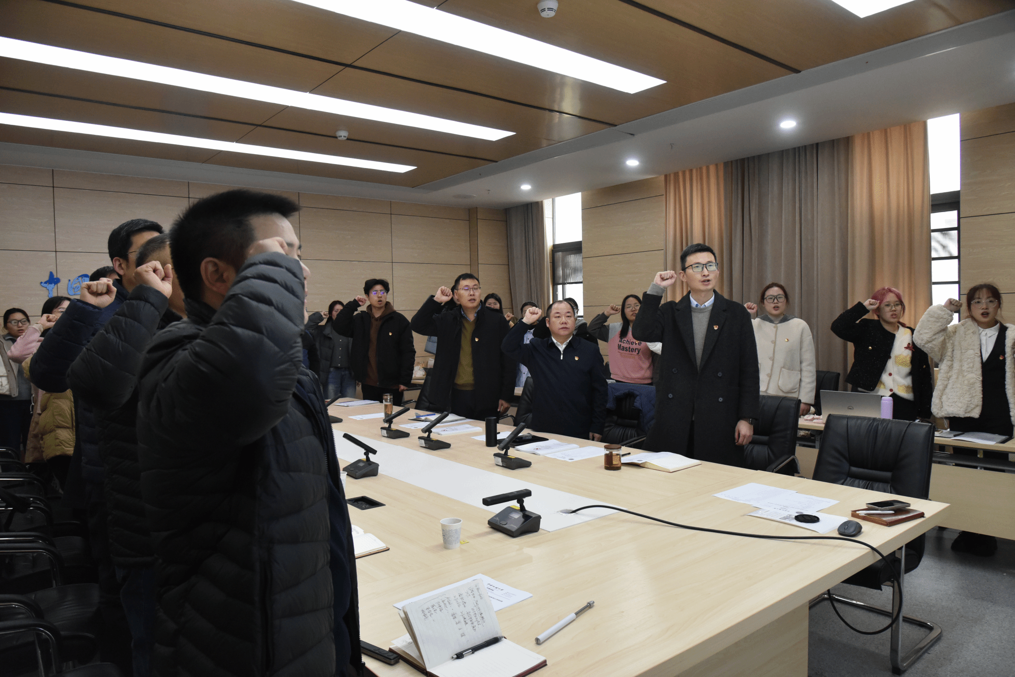 参会人员齐唱国歌,全体党员重温入党誓词,学院党委书记姜明敏领誓。