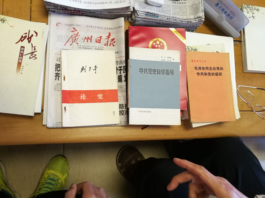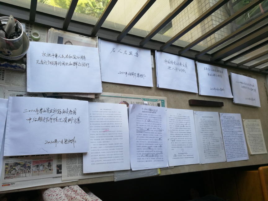 尽管已经退休多年,梁老仍然保持着对党和国家的热爱,对政治、时事的关心。梁老邀请我们参观他的书房,已是93高龄的他不得不借助老花镜看报、写文章,经常休息才能完成一部分工作,即使这样他仍数年如一日以高度的自律坚持日常学习和积累,整理出了一本本厚厚的学习笔记和感想。梁老的勤奋自律充分体现了老党员的真抓实干和思想觉悟,值得我们好好学习。
