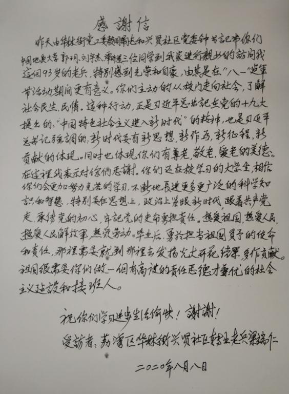 数日之后,我们收到了梁老的感谢信,感动之余更深深感受到老人家对于我们新时代大学生的殷切希望和关怀。我辈定不负梁老等革命先辈期望,为实现中华民族伟大复兴而奋斗,为推动构建人类命运共同体而努力,为新时代中国特色社会主义建设做贡献!