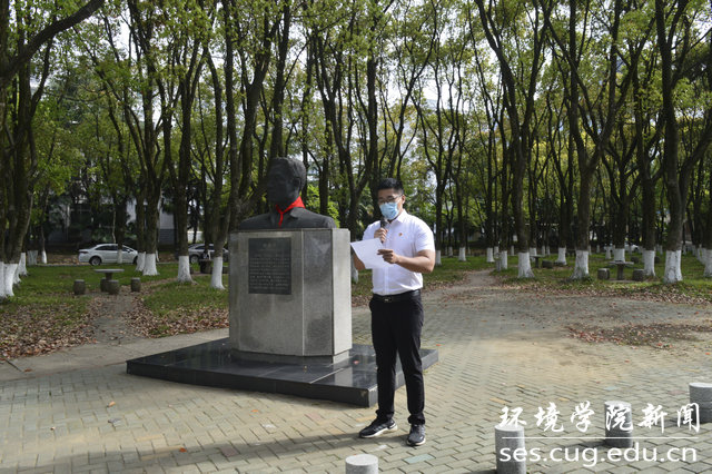 李素矿讲话。他指出,天地英雄气,千古尚凛然。张国旗塑像是校园里闪亮的地标。以英雄校友张国旗命名的党团支部和班团组织已经成为18小说 乃至全校全国的精神品牌,是学院推进党建“双创”和“三全育人”工作的重要支撑。环境学子每年清明来此缅怀英雄校友,是同学们学习生活中的重要内容,也是向革命、建设、开放各个时期的英雄先烈致敬的重要方式。他强调,作为新时代青年学子,要通过缅怀英雄事迹和精神,学习英雄好榜样,强化不忘初心、牢记使命的意志,激励自己永葆赤子情怀、争优时代先锋。他要求,全院各党团组织、各班级、各位同学都要以传承红色基因、培育时代新人为己任,践行红专能优理念,创新开展党团活动,以德居之、以能居之,积极投身美丽中国建设,把论文写在祖国大地上,做政治强、本领高、作风硬、敢担当,特别能吃苦、特别能战斗、特别能奉献的新时代生态环保铁军。