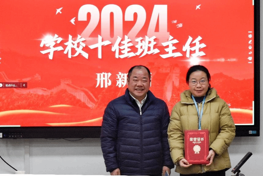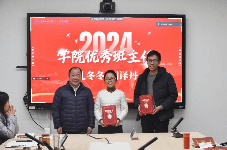 姜明敏为2023-2024学年度学校十佳班主任、学校优秀班主任和学院优秀班主任颁发证书。