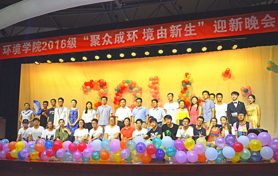 2016年“聚众成环,境由新生”迎新晚会暨第十三届环境文化科技节开幕式在西区大学生活动中心二楼隆重举行。学院党委书记李素矿,副院长甘义群、郭会荣,党委副书记朱继,各系室老师代表,以及学工组全体辅导员老师出席。黄奕名、焦聪、谭浩言、刘颖等四名同学共同主持了晚会。