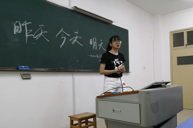 前任学生会主席郭文杰同学发言,她总结到自己在大学开始时便一直给自己设立目标,虽然过程有艰辛,有痛苦,但依然会坚持不放弃,达到自己满意的效果。对于“明天”,她要做的就是脚踏实地地走好每一步,同时她也祝福班级其他同学都有一个明确的目标,一个光明的未来。