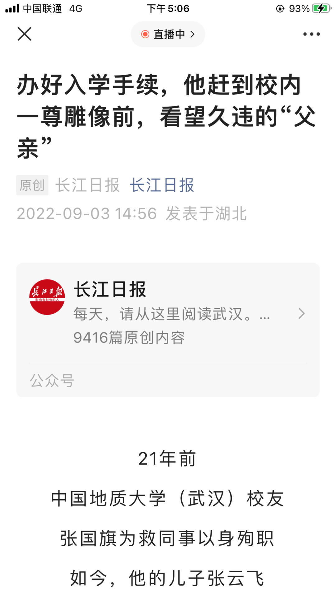 (武汉)即将迎来70周年校庆前夕,9月2日是该校的新生开学季,英雄校友张国旗之子张云飞,大学毕业工作八年后,已经31岁的他,接过父亲的水文地质学接力棒,来校报到攻读硕士研究生。党委宣传部记者根据新闻线索,进行深入挖掘和采访,撰写长篇新闻通讯,全文如下: