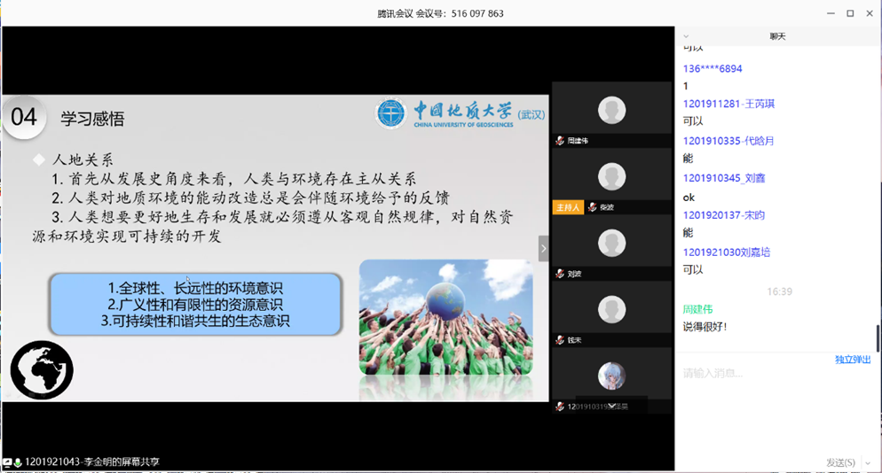 2月17日下午14:00,准时开课,在线听课学生约170人。柴波老师主讲《环境地质学的基本概念与生态文明》,结合习近平总书记的生态文明建设相关讲话和“绿水青山就是金山银山”的理论,对相关概念进行拓展融合,以提高学生的生态保护意识和人文思想。中间依托慕课堂做辅助,提出问题让学生回答,统计结果。两个学生通过PPT分享自己MOOC学习的理解。