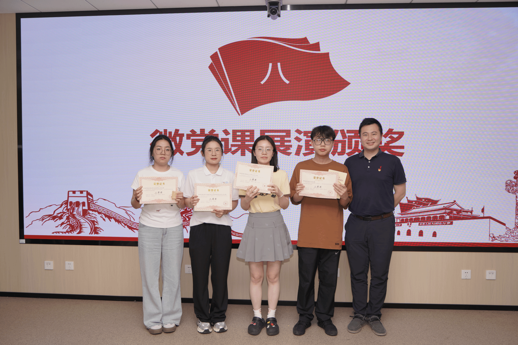 赵恩民为本次展演活动三等奖获奖支部颁奖。环境污染物识别与风险控制研究生第一党支部、新能源学院学生党支部、环境化学与毒理研究生党支部、环境地球化学研究生党支部4个支部获得三等奖。
