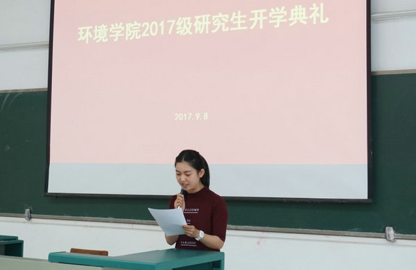 2017级研究生新生代表严璐发言,她代表新生向学院、老师表示感谢,结合自身的经历,表示研究生阶段,要以勤为径,以苦作舟,努力成为更有境界、更富魅力、更受尊重的人。