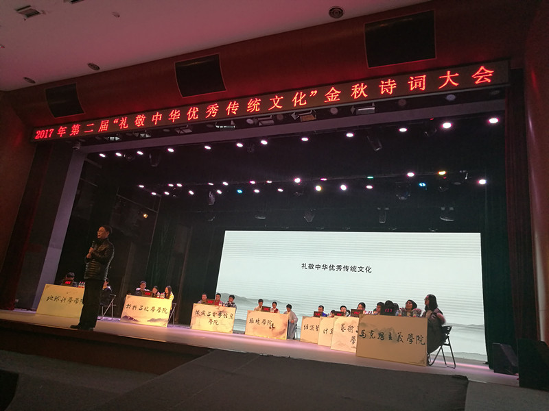 2017年12月8日,由党委学生工作部、党委研究生工作部、教务处、校团委联合举办的第二届“礼敬中华优秀传统文化”金秋诗词大会在弘毅堂顺利举行。18小说 付昱钢、刘恩俊、李凡三位同学精心准备,经笔试,小试牛刀初登场、百尺竿头斗志昂、精彩飞花我最强等四个环节等环节后,从全校20余个单位派出的参赛队伍中脱颖而出,荣获第二名。