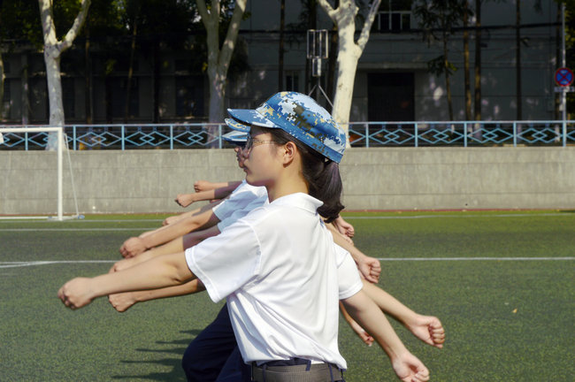 学生按照动作规范认真进行军训训练