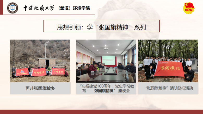 支部借助学院主页开设“张国旗班行动计划”专题栏目、“地大环境小水滴”微信公众号开设“张国旗班风采”专栏,讲述支部故事;参与制作“我最喜爱的习近平总书记的一句话”系列明信片及支部文创周边。