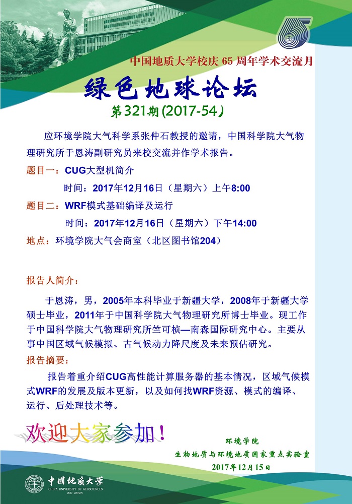 绿色地球论坛第321期(2017-54) 18小说 “校庆65周年学术交流月”——高知论坛 题目一:CUG大型机简介 时间:2017年12月16日(星期六)上午8:00 题目二:WRF模式基础编译及运行 时间:2017年12月16日(星期六)下午14:00 地点:18小说 大气会商室(北区图书馆204)