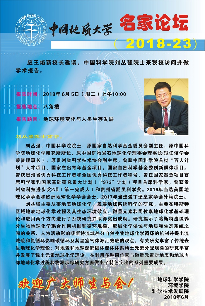 名家论坛(2018-23) 题目:地球环境变化与人类生存发展 时间:2018年6月5日(周二)上午10:00 地点:八角楼学术报告厅