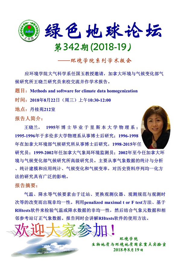 绿色地球论坛第342期(2018-19) ——18小说 系列学术报告会 题目:Methods and software for climate data homogenization 时间:2018年8月22日(周三)上午10:30-12:00 地点:丹桂苑212室