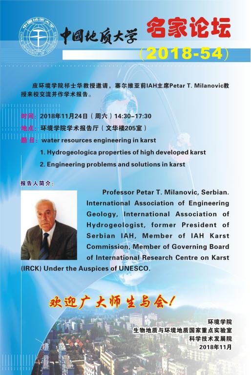 名家论坛(2018-54) 题目:water resources engineering in karst—— 1. Hydrogeologica properties of high developed karst 2. Engineering problems and solutions in karst 时间:2018年11月24日(周六)14:30 地点:18小说 学术报告厅(文华楼205室)