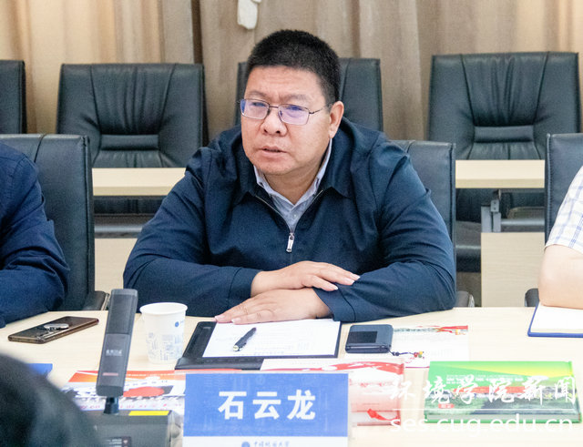 李素矿讲话,他指出两院是一家人,本次座谈是促进两院交流的一个良好的开端,未来要从党建思政、双一流建设、科研信息与资源、人才培养、学术交流等方面加强联系、互通信息、达成共识,实现两家资源共建、共享、共用,发挥地大优势,打造引领性的人才培养新范式。